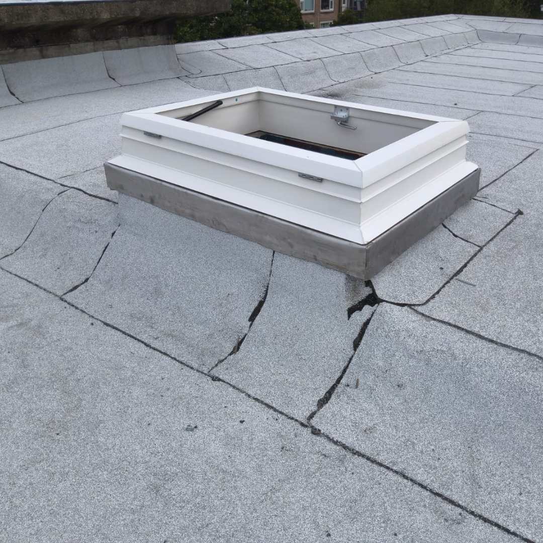 Onze monteur aan het werk: dakluik waterdicht afgewerkt op een bestaande opstand in Amsterdam.